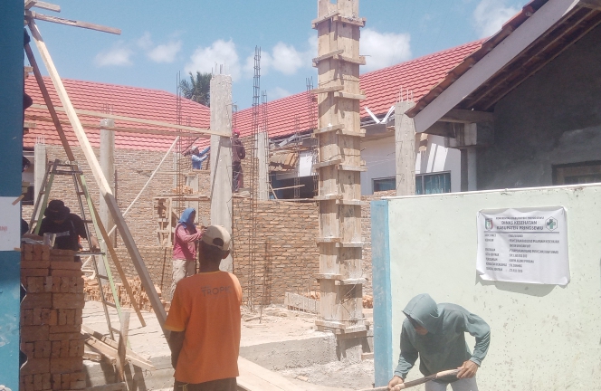 Pekerja pembangunan penambahan gedung puskesmas Banyumas terlihat tidak ada yang menggunakan keselamatan dan kesehatan kerja (k3)