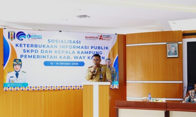 Sekretaris Daerah Kabupaten Way Kanan, Machiavelli Herman Tarmizi, S.STP., M.Si., membuka Kegiatan Sosialisasi Keterbukaan Informasi Publik di Lingkungan Pemerintah Kabupaten Way Kanan Tahun 2025 di Ruang Buway Pemuka Pengiran Tuha, Senin (13/10/2025).